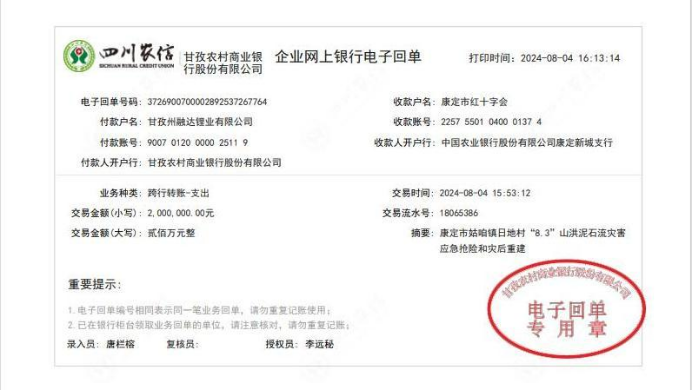 山洪無情,人間有愛。在災情發生后的第一時間,呂向陽董事長迅速決策,于8月4日15點53分通過當地子公司甘孜州融達鋰業有限公司向康定市紅十字會捐款200萬元,用于災害應急搶險和災后重建。康定市紅十字會表示,融達鋰業是第一個向災區捐款的企業,并對融捷集團表示感謝。